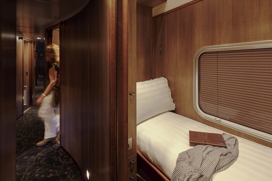 Gold Single offers a compact sleeper cabin featuring a bed that converts to a seat by day and shared shower/toilet facilities located at the end of the carriage
