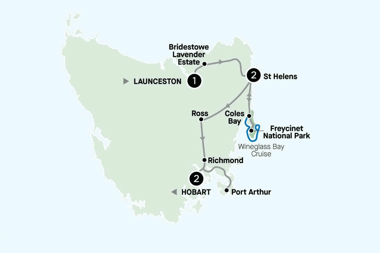Travel through the stunning beauty of east coast tasmania by land taking in the breathtaking scenery of Freycinet National Park from Launceston to Hobart.