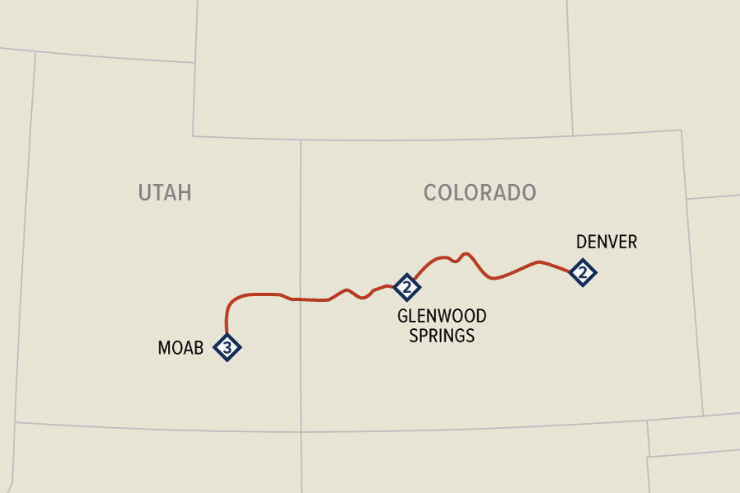 Enjoy the morning at your own leisure. Depart Moab in the afternoon and travel onboard Rocky Mountaineer. You'll cross the Utah-Colorado border with stunning mountain views in the background before arriving back in the resort town of Glenwood Springs. Overnight in Glenwood Springs. D.
