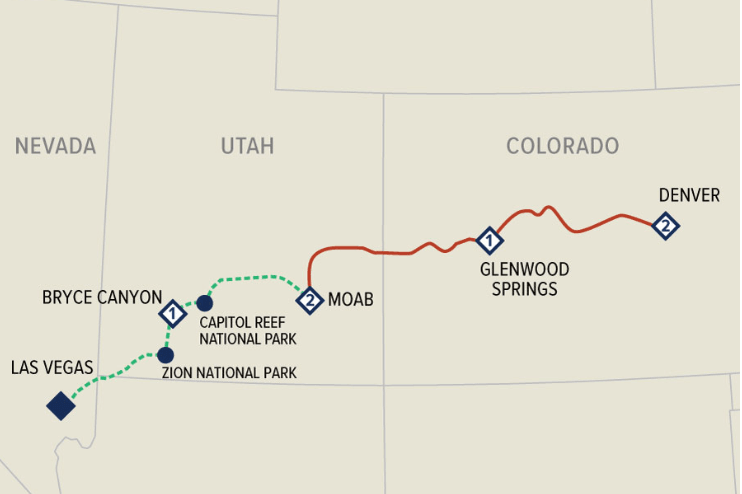Depart Denver and travel onboard Rocky Mountaineer. Cross the Continental Divide as you take in the spectacular views of rugged canyons and the Colorado River before arriving at the resort town of Glenwood Springs. Overnight in Glenwood Springs. B, L.