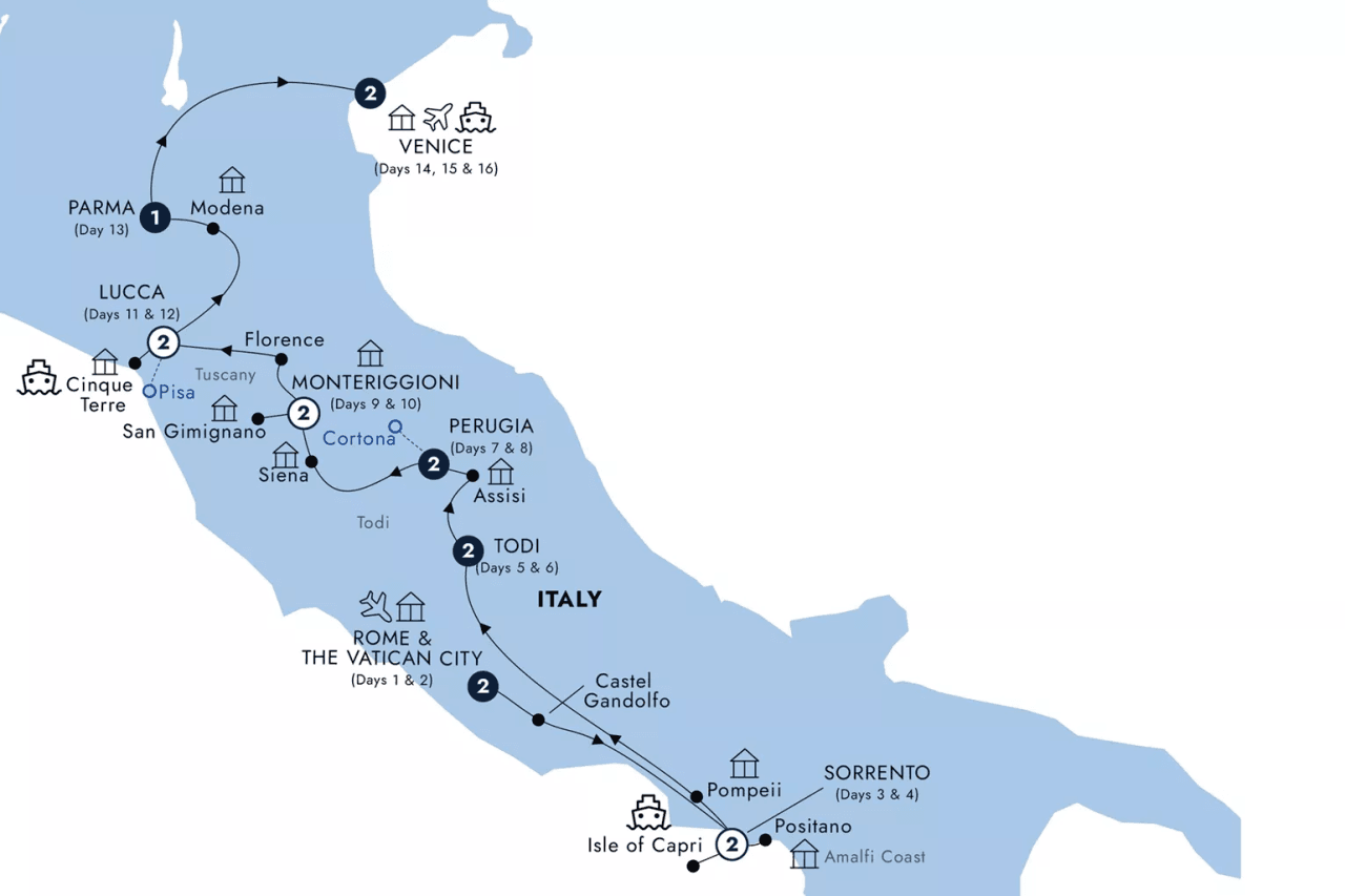 Journey to the ancient Roman city of Pompeii to explore this extraordinary site with your Local Expert. Travel into the heart of Italy to enjoy free time in Todi, located on a hilltop pedestal overlooking a vineyard-covered plain. Savour the distinctly medieval ambiance during your orientation and admire the Piazza del Popolo where locals take their evening 'passeggiata'. Cap off the day dining at a local restaurant with a glass of Orvieto Classico wine - a magical culinary experience.