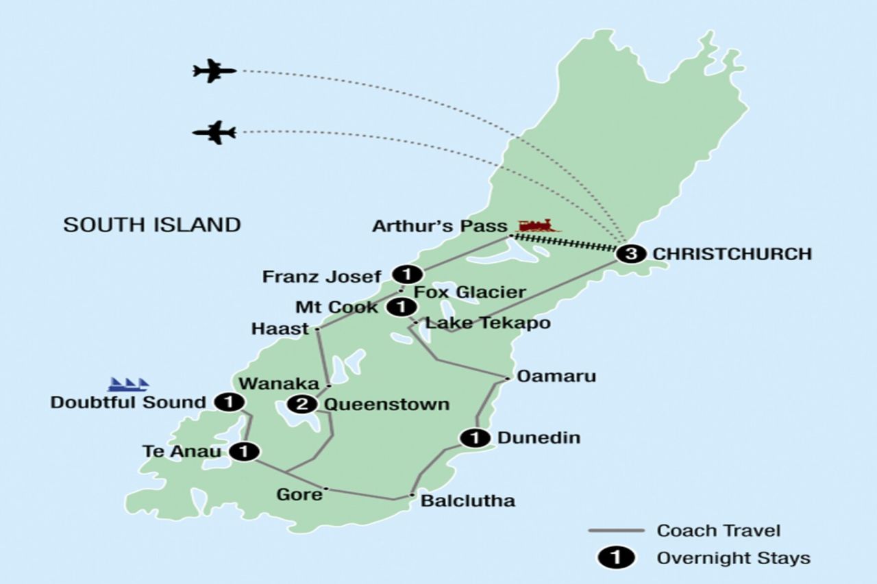 Travel to Hokitika and visit the Greenstone Factory before arriving at Arthur’s Pass where you board the TranzAlpine, renowned as one of the great train journeys of the world. View rivers and valleys as you travel through the Waimakariri Basin, over massive viaducts and through the patchwork farmlands of the Canterbury Plains. On arrival into the elegant city of Christchurch, your Ultimate Coach will be waiting to transfer you to your hotel. This evening reminisce on the memories shared with your new friends at the farewell dinner which includes selected beverages.