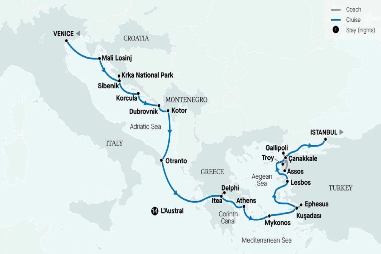 On arrival in Venice, transfer to your ship and settle into your spacious suite. This evening, get to know your crew and fellow travellers at a welcome dinner. Stay 14 Nights: L'Austral