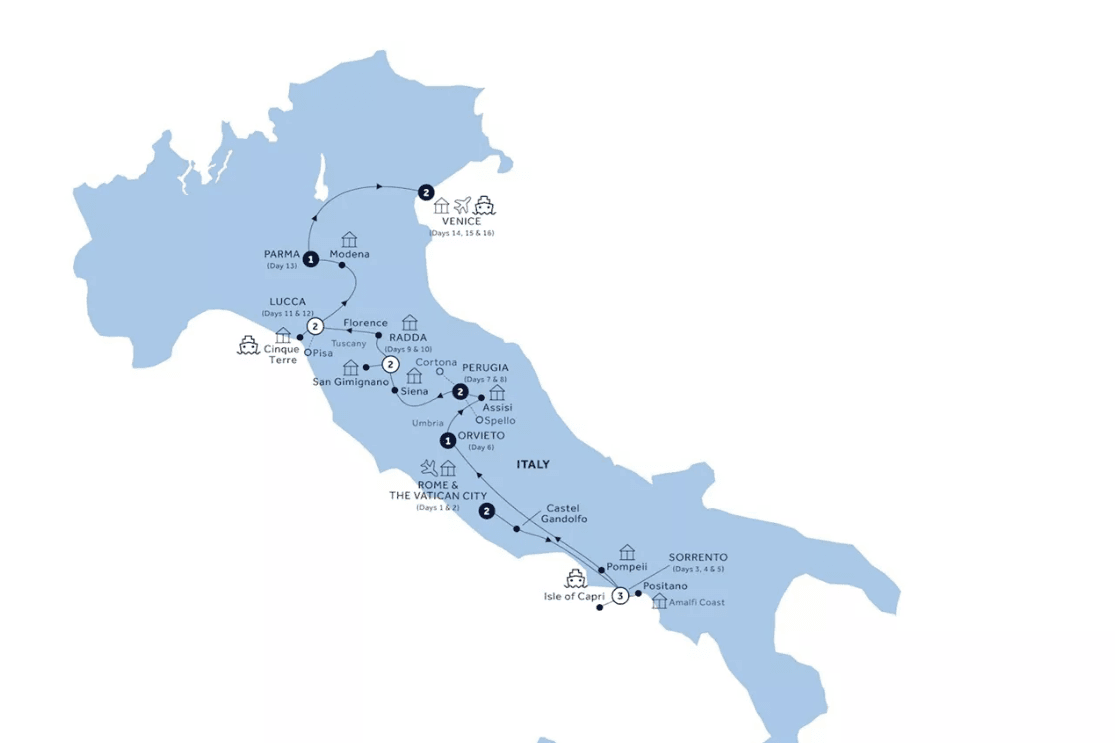 Journey across the Italian peninsula in this 16-day guided tour that stretches from the sapphire waters of the Amalfi Coast to the calming canals of Venice.