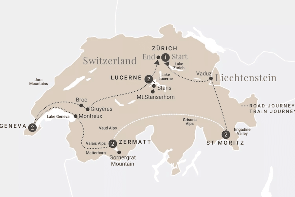 From St. Moritz to Zermatt and onto Geneva, this once-in-a-lifetime itinerary ventures across Switzerland aboard the Glacier Express.